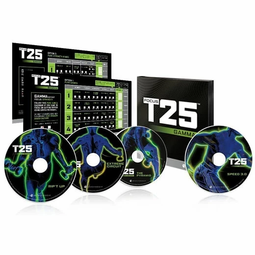 Ready to push yourself and accelerate your FOCUS T25 results? Then GAMMA Phase workouts are for you! While the GAMMA Phase is designed to be integrated into FOCUS T25¡¯s ALPHA and BETA workouts, it¡¯s also exceptionally effective as a stand-alone workout programme as well. In GAMMA, you¡¯ll strengthen and streamline your biceps, triceps, shoulders, and back while accelerating your reps and blasting through fat. Think you got what it takes? Prove it! To yourself, and the world. It¡¯s time to get the body you¡¯ve always wanted in half the time of traditional training. It¡¯s time to ramp up your results. It¡¯s time to GET IT DONE with FOCUS T25 GAMMA. What’s included? Four 25-minute workouts on four DVDs, PURE GAMMA calendar, and PURE STRENGTH hybrid calendar The Workouts: Rip’t Up – Strengthen and streamline your biceps, triceps, shoulders, back, and chest with Shaun’s 360¡ã upper-body moves. Extreme Circuit -Build lean muscle and burn fat at the same time! In this one, the weights never leave your hands. Not even for the warm-up. The Pyramid-Accelerate your reps as time progresses. This is your 25-minute cardio and strength endurance test. Speed 3.0 -Faster pace. More sweat. Serious results. You won’t want to miss this 25-minute high-speed challenge. Helpful tools: PURE GAMMA calendar – This calendar focuses on getting you ripped with the FOCUS T25 GAMMA cycle. PURE STRENGTH hybrid calendar – Integrates the strength-based workouts from all FOCUS T25 cycles, ALPHA, BETA, and GAMMA, so you can carve lean, strong muscles from head to toe.